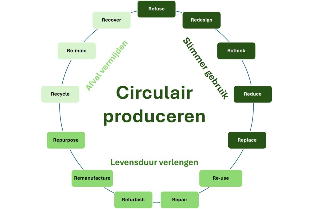Er zijn diverse manieren met betrekking tot circulair produceren. In het Engels zijn deze verwoord in een aantal R’s verdeeld over 3 categorieën te weten: